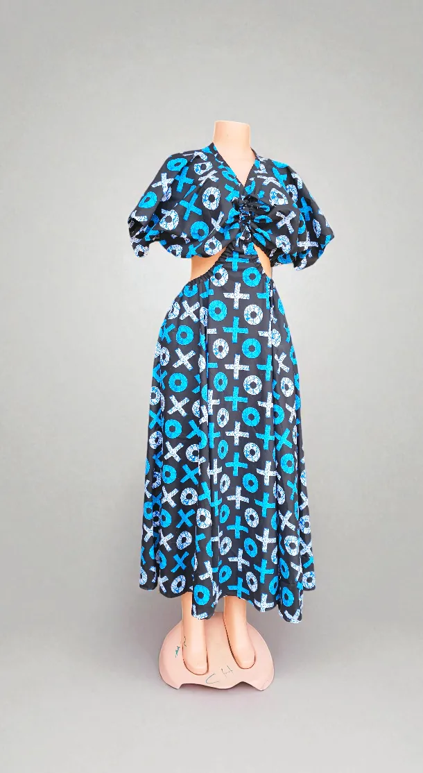 Make a bold style statement in this vibrant midi dress featuring a playful geometric print in electric blue, white, and charcoal gray. The eye-catching pattern combines crosses, circles, and abstract shapes for a contemporary, artistic look.